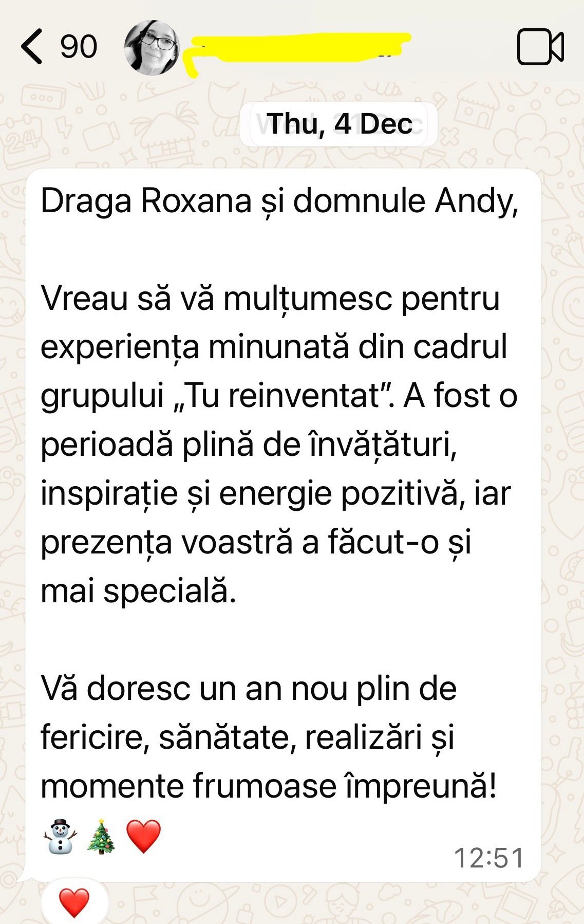 „Toți participanții reușesc, în doar câteva sesiuni, să identifice blocaje invizibile care le afectau stima de sine, deciziile sau relațiile. Asta pentru că metoda folosită în TU, REINVENTAT nu se bazează pe teorie, ci pe exerciții ghidate, testate deja în grupuri reale din România.”