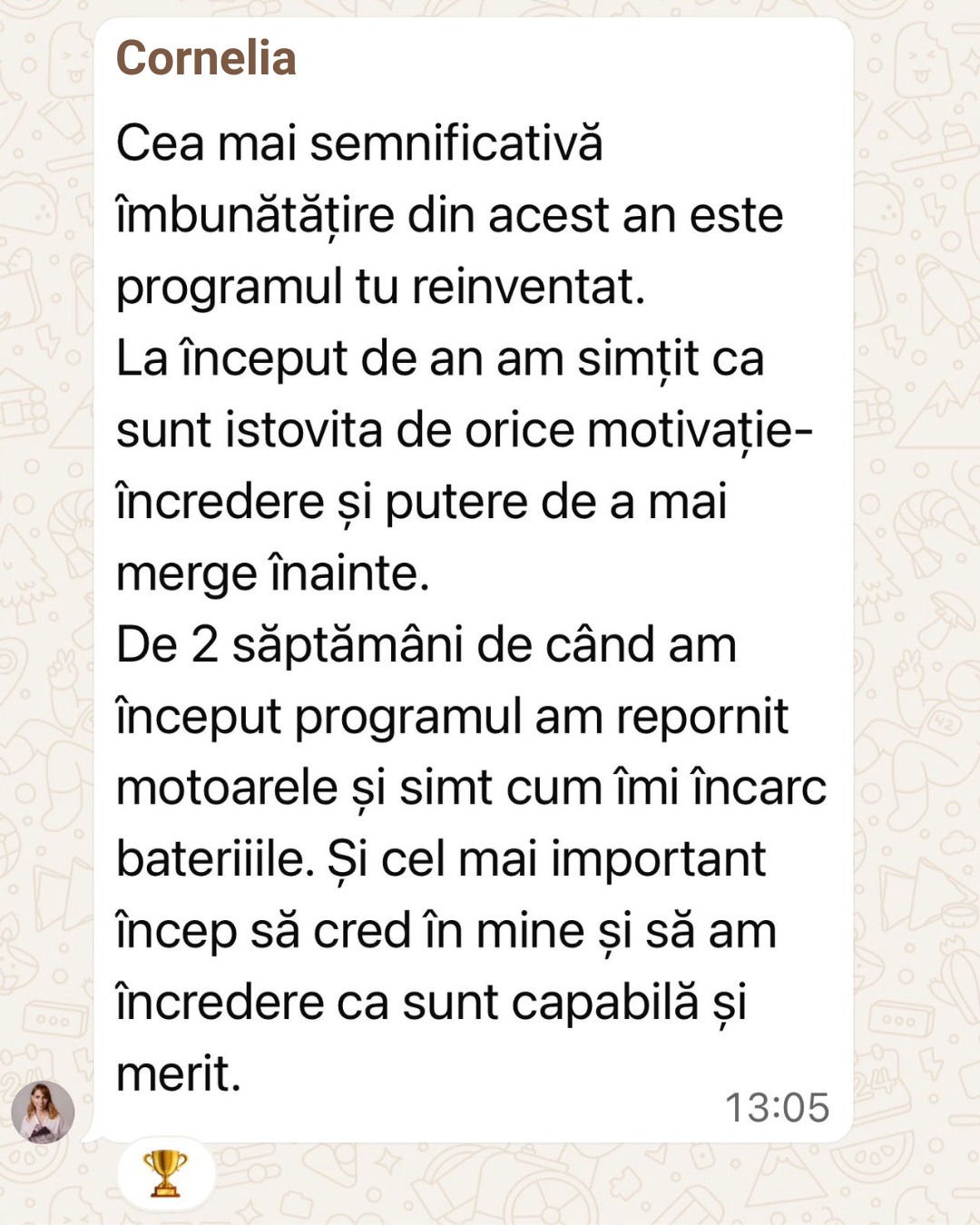 Participă la programul transformațional unde elimini convingerile limitative, îți găsești claritatea obiectivelor și motivaţia ca să îți reinventezi viața!